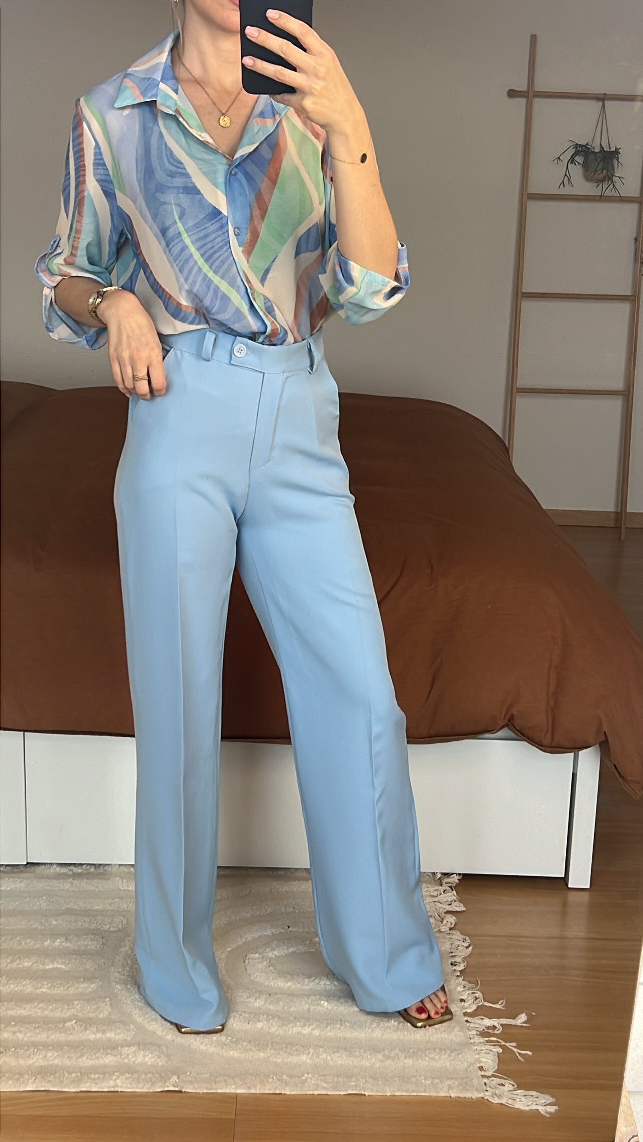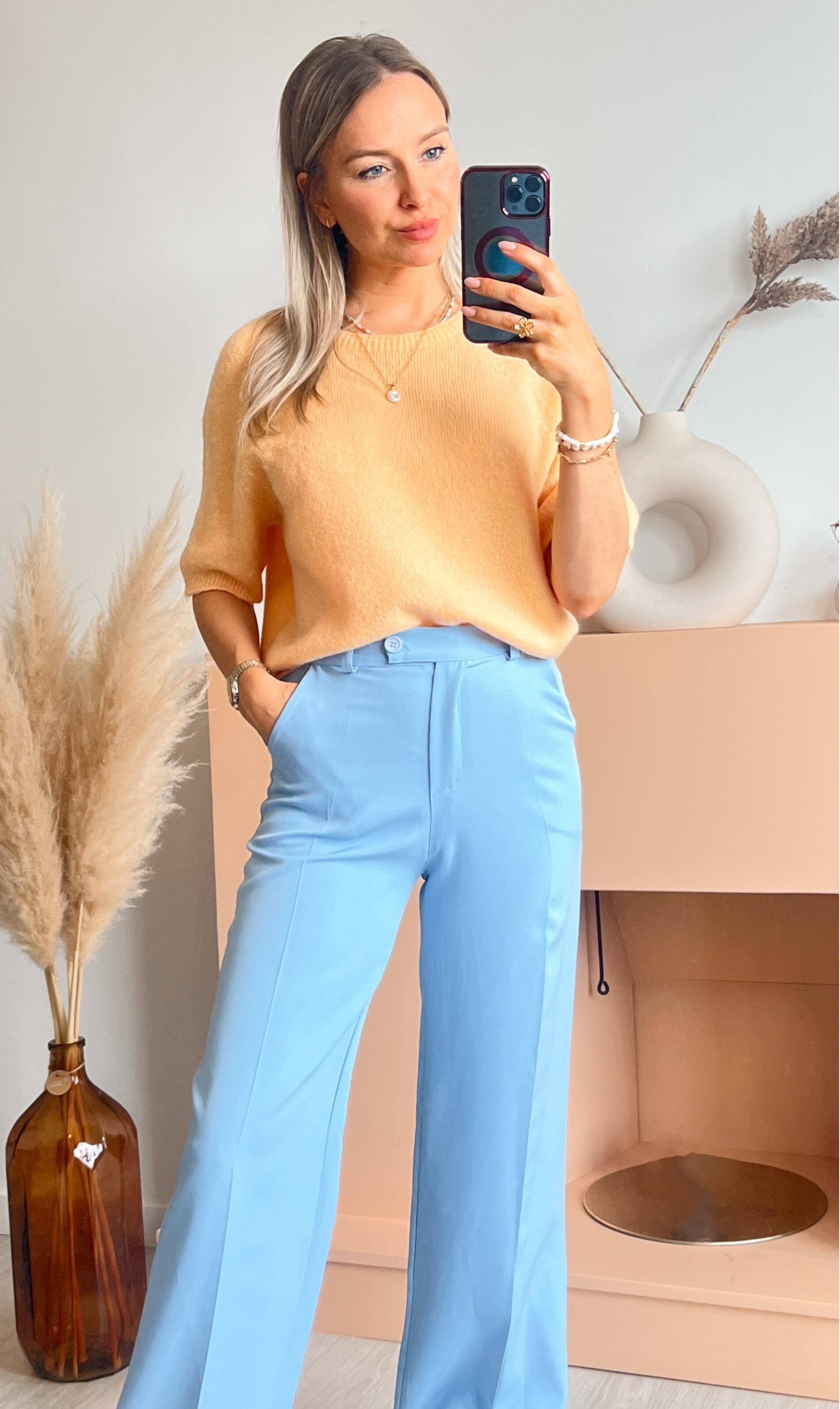 Voeg een vleugje verfijning toe aan je garderobe met deze babyblauwe geklede broek.
