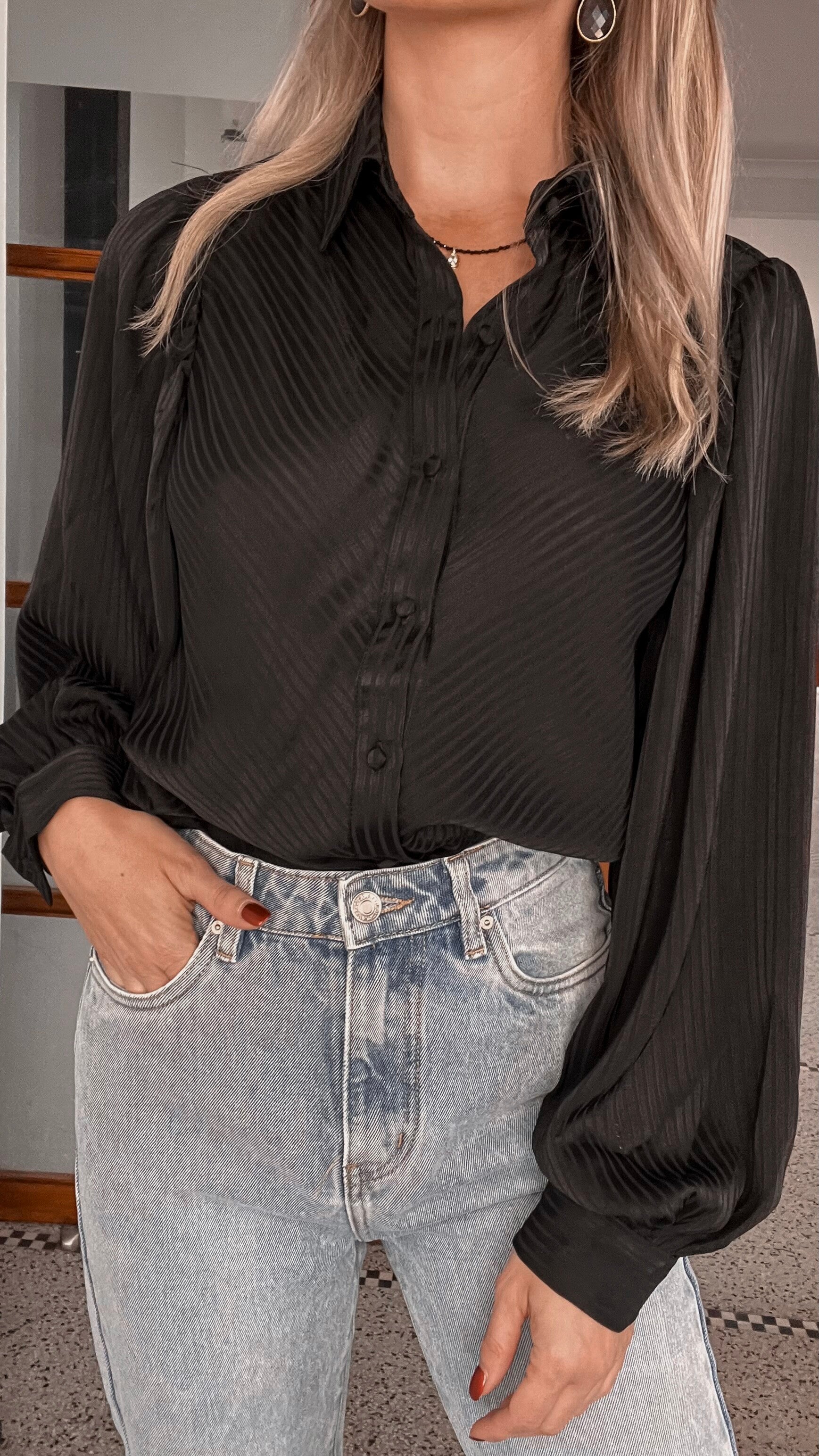 Deze prachtige blouse Jolie is een absolute must-have voor elke stijlvolle garderobe. Gemaakt van een verfijnde, semi-transparante stof met een subtiele glans, geeft deze blouse je outfit direct een luxe uitstraling. De subtiele strepen in de stof voegen een extra dimensie toe aan de look. Onderaan lopen de mouwen iets wijder uit, wat zorgt voor een moderne twist en extra comfort.