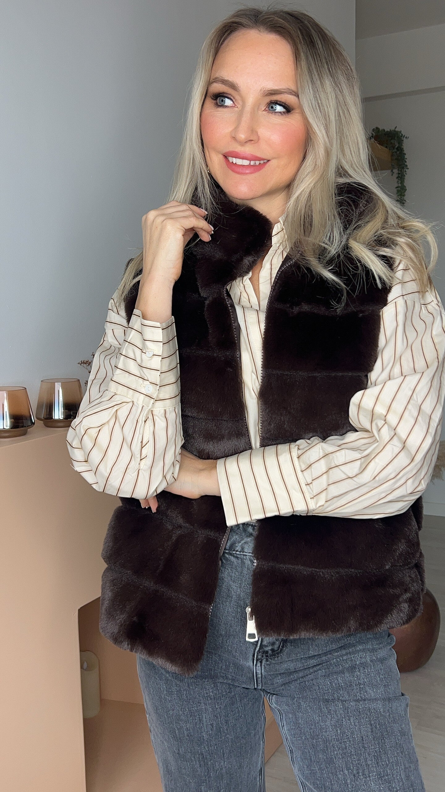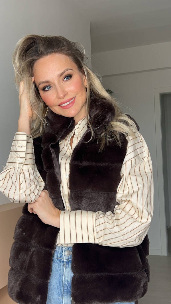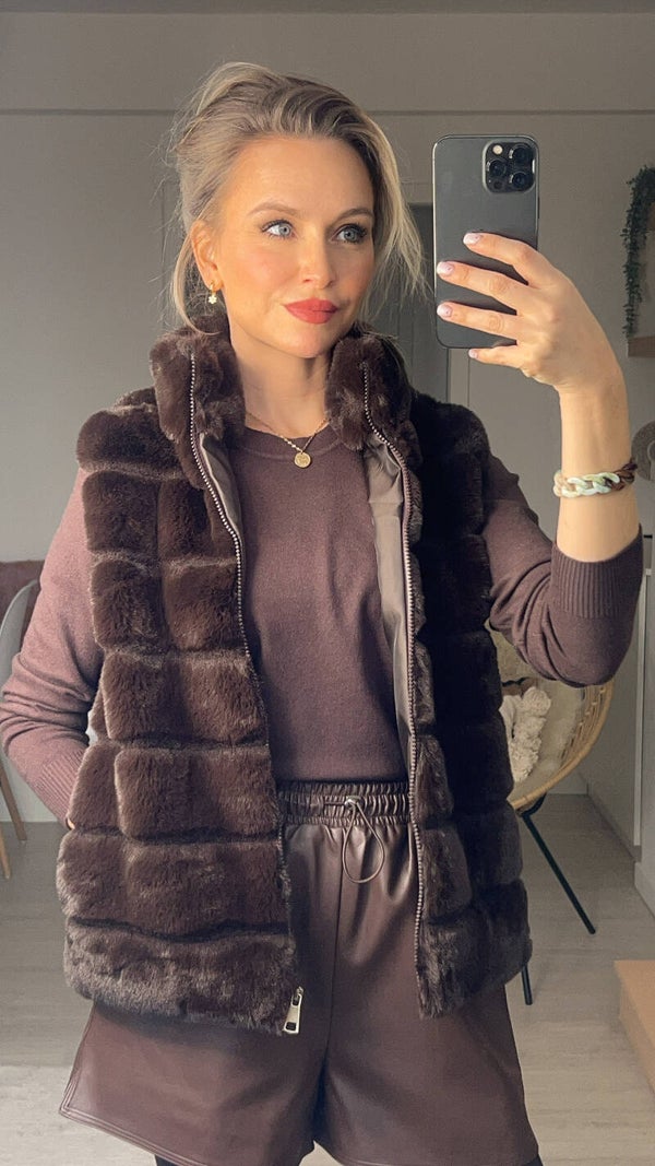 Deze luxueuze gilet in een warme chocolade bruine kleur straalt pure elegantie uit en is gemaakt van uitzonderlijk zacht imitatiebont.