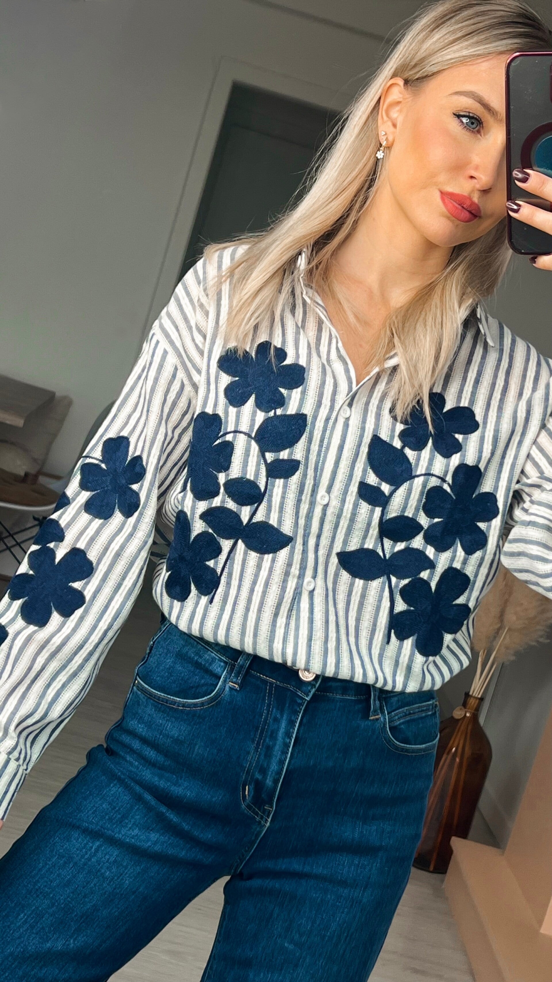 Dit stijlvolle, licht oversized hemd combineert een tijdloze blauw-witte streep met elegante donkerblauwe bloemendetails op de borst en mouwen. Gemaakt van een luchtige, ademende stof, perfect voor zowel kantoor als een avondje uit.