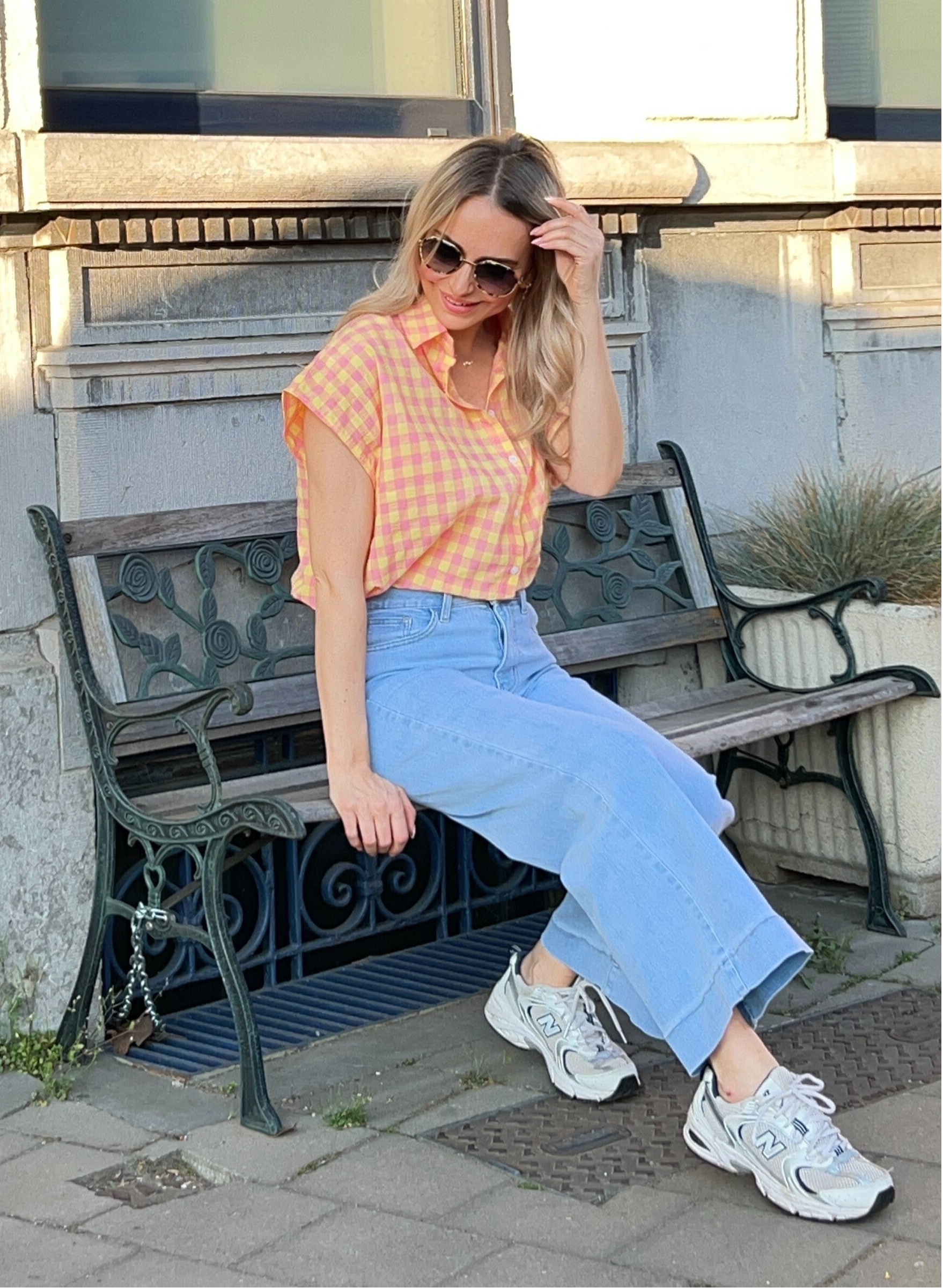 Dit geruite hemdje in een vrolijke combinatie van geel en roze is een perfecte balans tussen speels en vrouwelijk. Het hemdje heeft korte mouwen en het opstaande kraagje.
