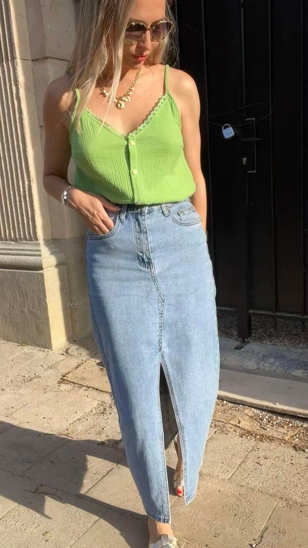 De Emily Skirt is een stijlvolle spijkerrok in een medium denimkleur, ontworpen voor zonnige dagen. De rok heeft een hoge taille, een rechte pasvorm en een flatterende split aan de voorkant, die zorgt voor een vrouwelijke uitstraling en extra comfort tijdens het bewegen. Dankzij de klassieke rits- en knoopsluiting en de handige steekzakken is de Emily Skirt zowel praktisch als trendy. Perfect te combineren met een top of blouse voor een frisse en moderne look.