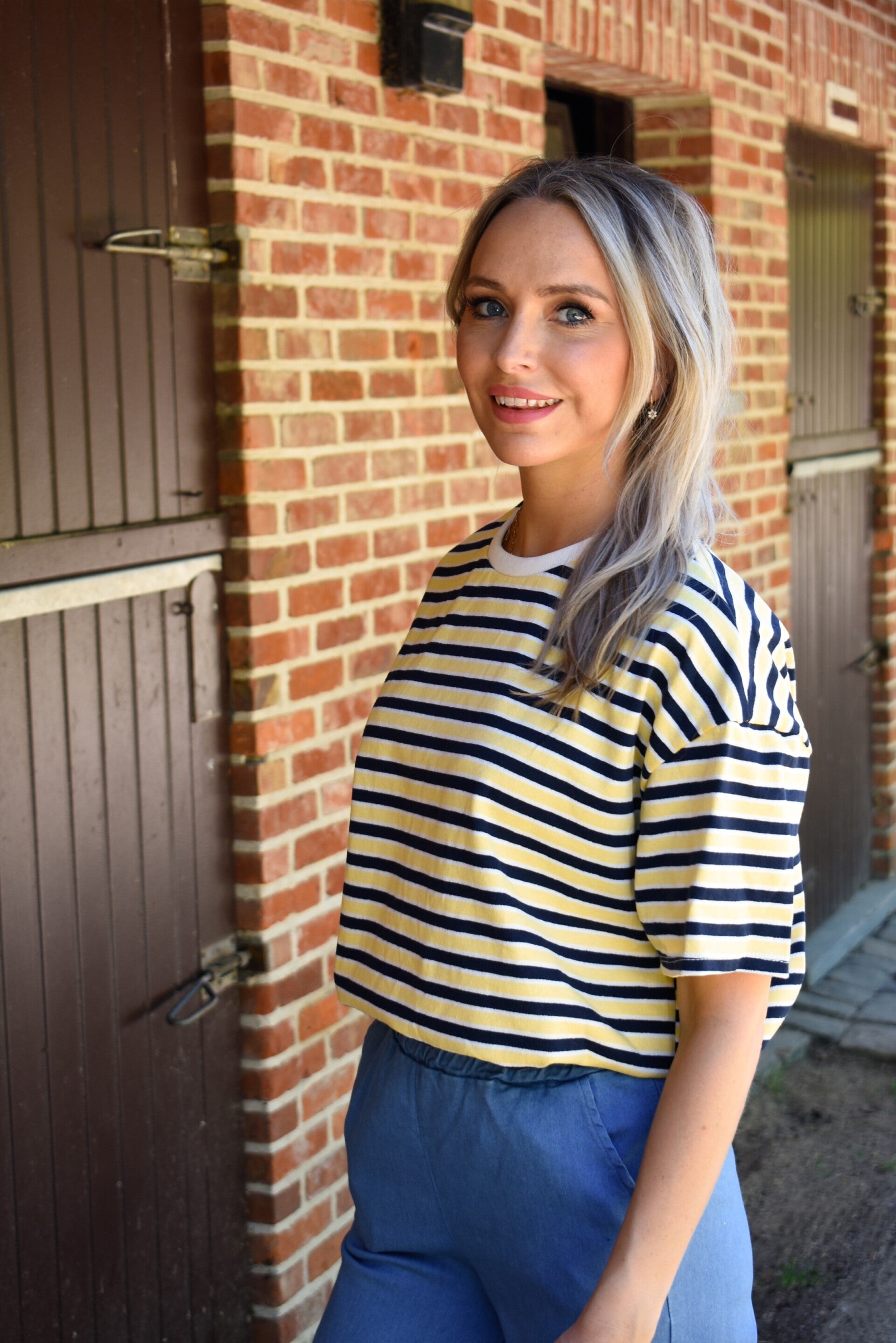 Fris, trendy en veelzijdig: dit gestreepte T-shirt in geel, donkerblauw en een fijn wit lijntje is een echte allemansvriend. De stevige katoenen stof zorgt voor een mooie pasvorm en voelt comfortabel aan. Draag ’m casual op een jeans of combineer met een geklede broek voor een meer uitgewerkte look. De T-shirt valt los en past mooi van maat XS tot een ruime L. Een makkelijk stuk dat altijd werkt, hoe je ’t ook draagt.
