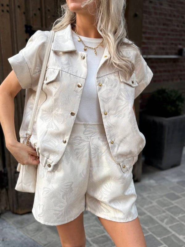 Set Olivia is dé combinatie van comfort en elegantie in één look. De glanzende stof met subtiel bloemenreliëf geeft deze matching short en vest net dat tikkeltje extra, zonder over de top te zijn. Het jasje heeft een nonchalante snit met stoere details, terwijl de bijpassende short soepel valt en een relaxte pasvorm heeft. Samen vormen ze een outfit die moeiteloos stijlvol is – perfect voor een dag in de stad of een zomerse avond met vrienden. Draag Olivia met sneakers voor een sporty vibe, of met sandalen voor een meer vrouwelijke feel.
