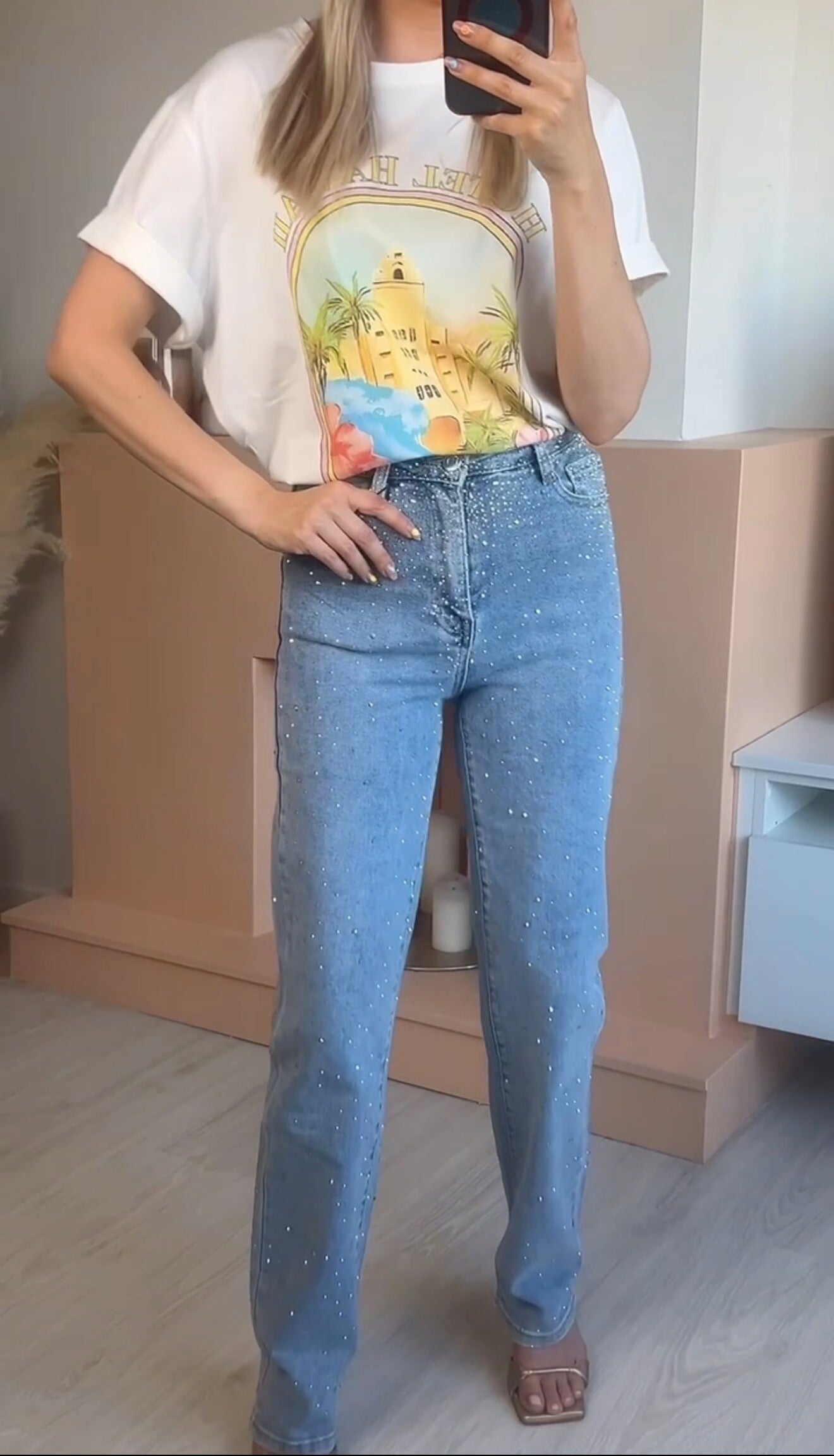 Deze full length jeans met rechte pijp en lichte stretch combineert comfort met een subtiele sparkle. De strass steentjes over de hele broek geven je outfit net dat beetje extra glamour, zonder over the top te zijn. Perfect te combineren met een basic top of een statement blouse.