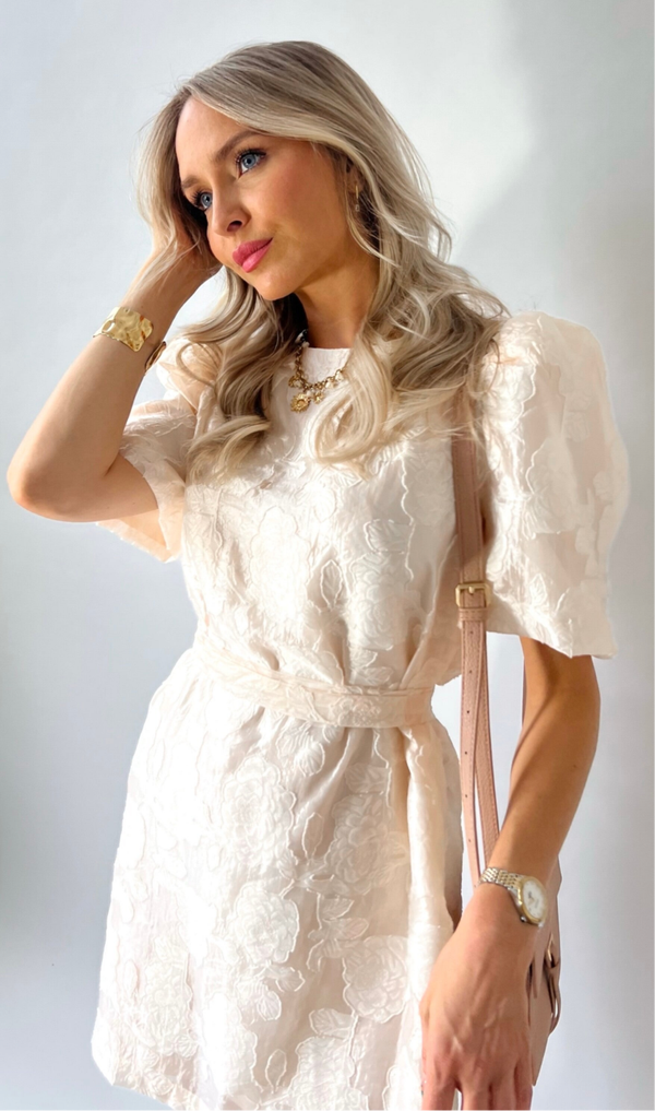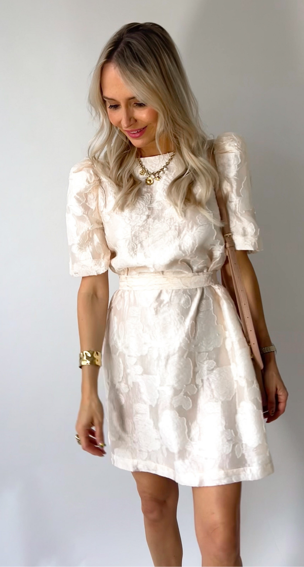 Ons 'Celeste kleedje' is pure romantiek in kledingvorm. Deze jurk in een zachte crème kleur is gemaakt van een elegante stof met een verfijnd bloemenreliëf en een lichte transparantie. De korte pofmouwen, ronde halslijn en bijpassend lintje zorgen voor een vrouwelijke, flatterende pasvorm. Perfect voor een speciale gelegenheid of een stijlvolle daglook.