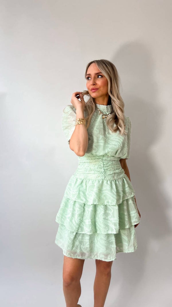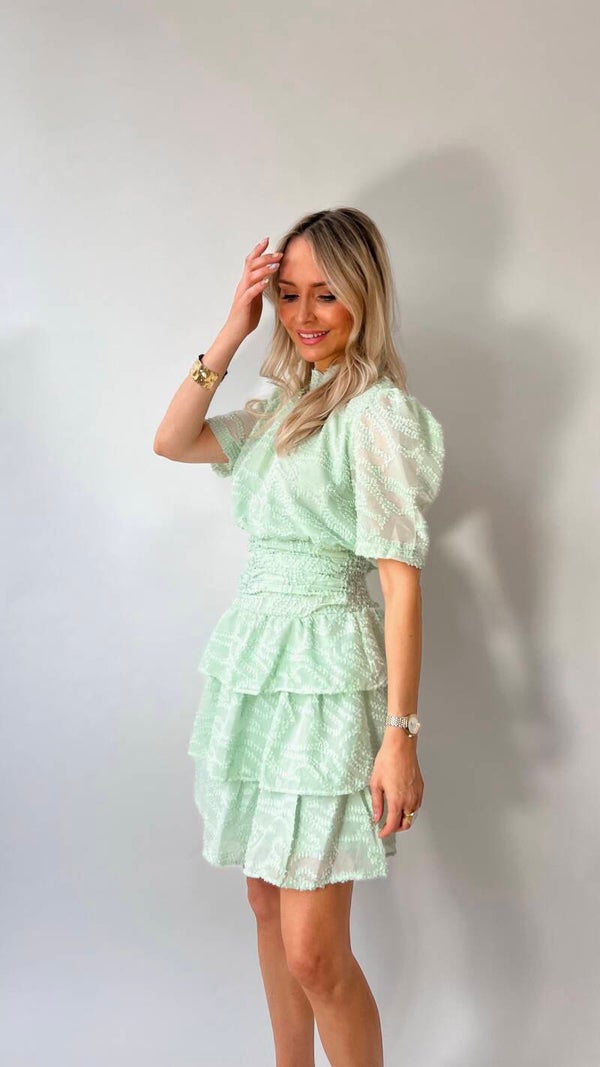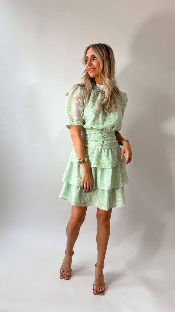 Deze dromerige, mintgroene jurk is een verfijnde keuze voor speciale momenten. De luchtige structuurstof, vrouwelijke pofmouwtjes en sierlijke laagjes geven het jurkje een romantische uitstraling die zowel elegant als speels is. De elastische taille zorgt voor een comfortabele pasvorm die je silhouet mooi accentueert.