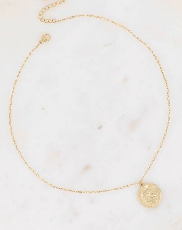Voeg een vleugje elegantie toe aan je look met onze “Elena” ketting, een verfijnd sieraad met een klassieke goudkleurige muntbedel. Deze minimalistische ketting is perfect om solo te dragen of te combineren met andere lagen voor een trendy, layered necklace look.