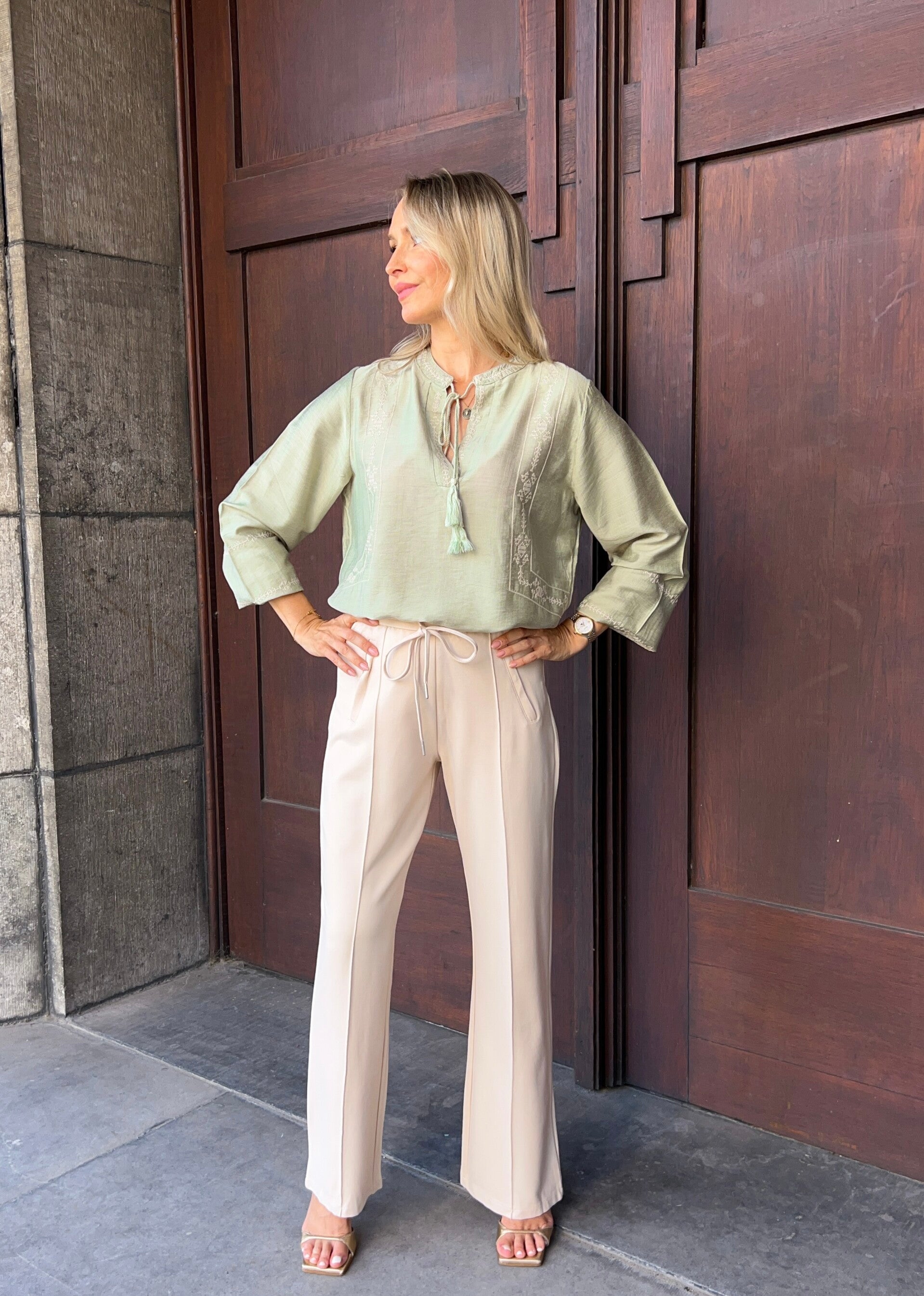 Beige geklede joggingbroek in een casual chic stijl. Lina voelt aan als een jogging, maar oogt elegant dankzij de rechte snit en subtiele details. Met elastische tailleband, aansnoerkoord en steekzakken met rits. Verkrijgbaar van S t/m XL.