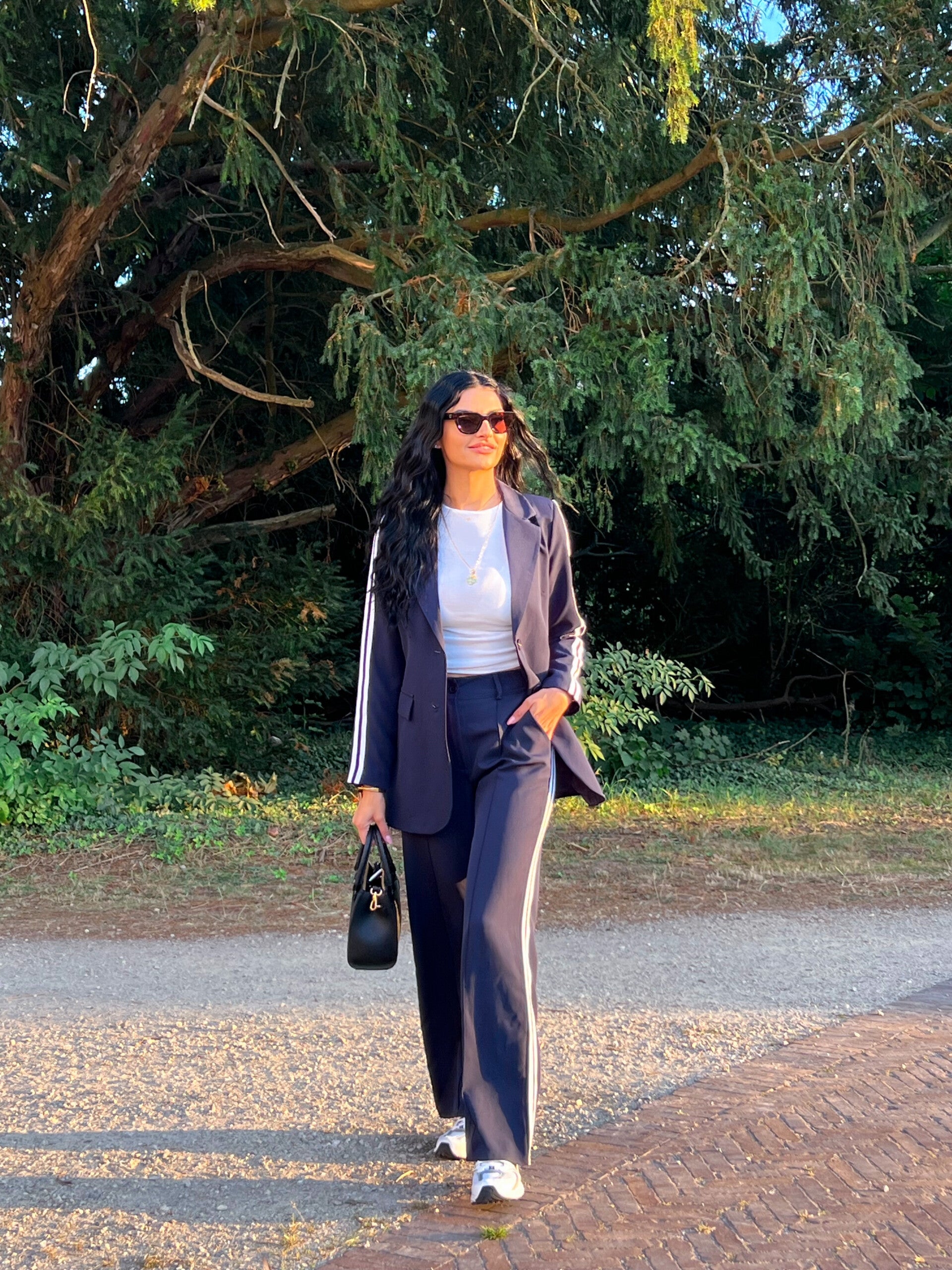 Sportief-chic dameskostuum in navy, bestaande uit een elegante blazer en een wijde broek. Dankzij de stretch en de sportieve strepen langs de zijkanten combineert Eloria moeiteloos stijl met comfort. Verkrijgbaar in S/M en M/L.