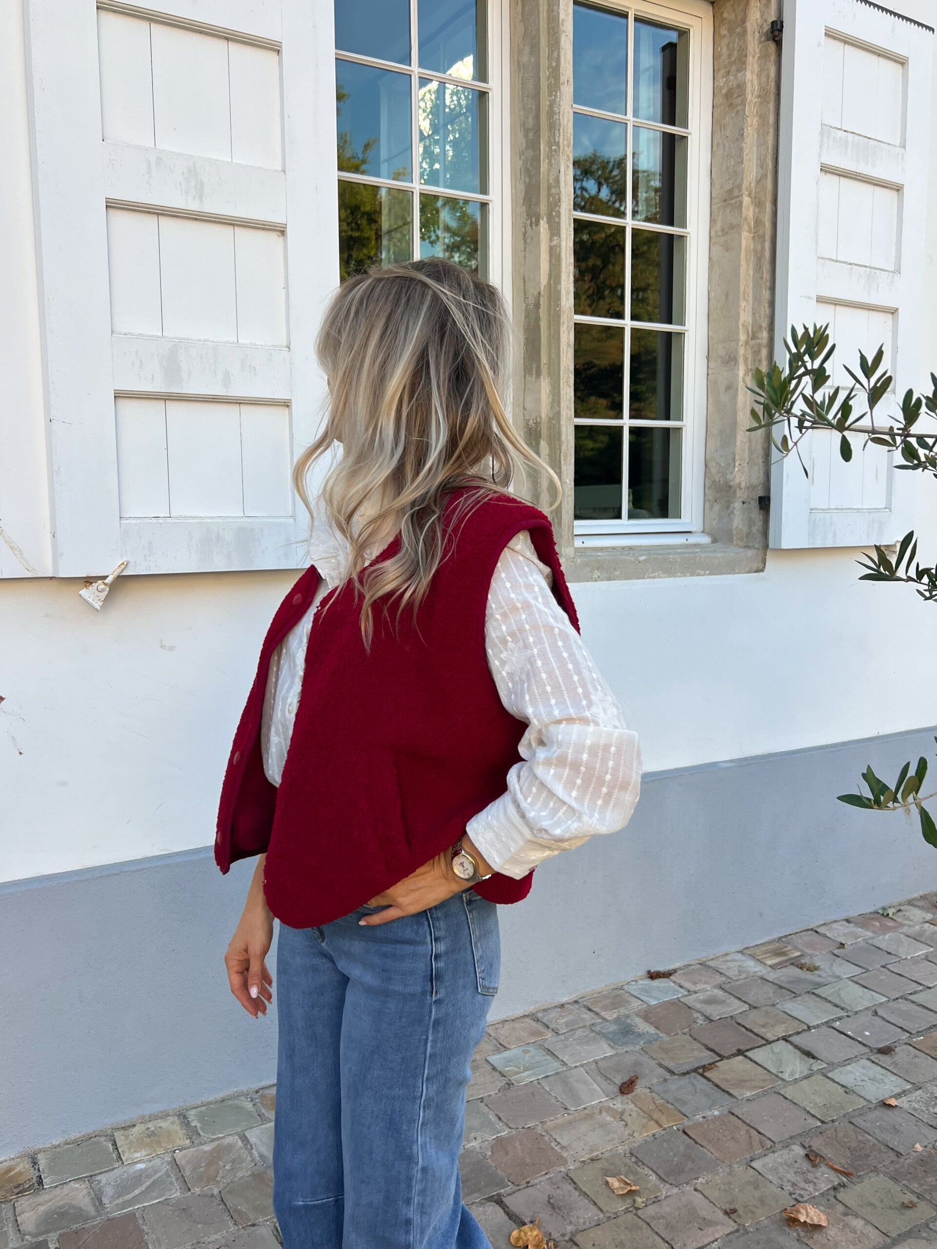 Dit burgundy teddy gilet is een absolute must-have voor dit seizoen. Gemaakt uit een warme, zachte stof geeft het haar een cosy uitstraling. Sluit met drukknoopjes en bevat 2 handige zakjes. Perfect om je outfit extra stijl en warmte te geven. Onesize pasvorm: draagbaar van XS tot XL.