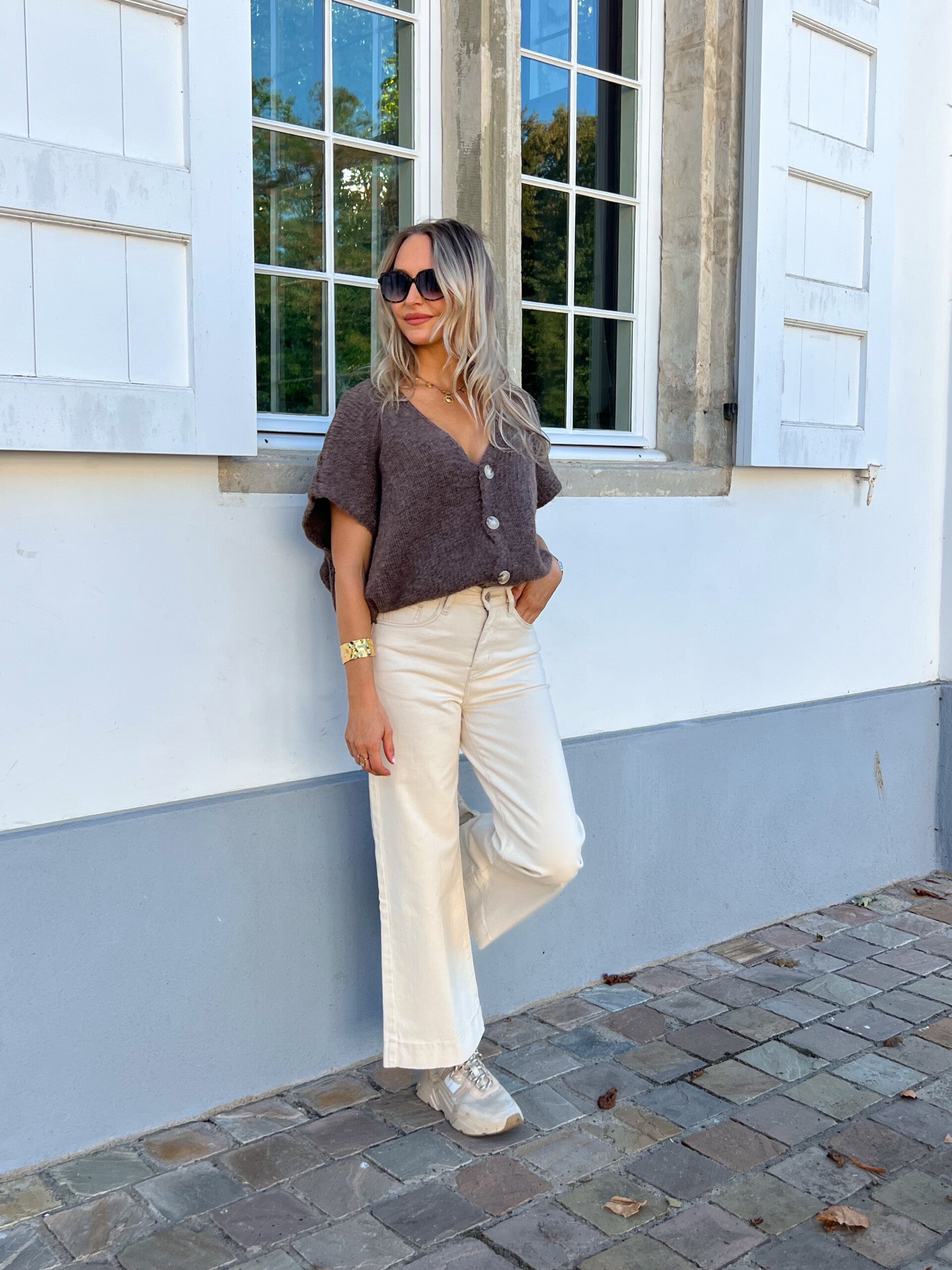 Dit prachtige gilet in een warme taupkleurige tint is een echte must-have voor dit seizoen. De zachte, niet-prikkende stof voelt heerlijk comfortabel aan en maakt dit item ideaal om te combineren met zowel casual als iets gekledere looks. Dankzij de ruime pasvorm en de stijlvolle knopen vooraan kan je het open of gesloten dragen, afhankelijk van je outfit.