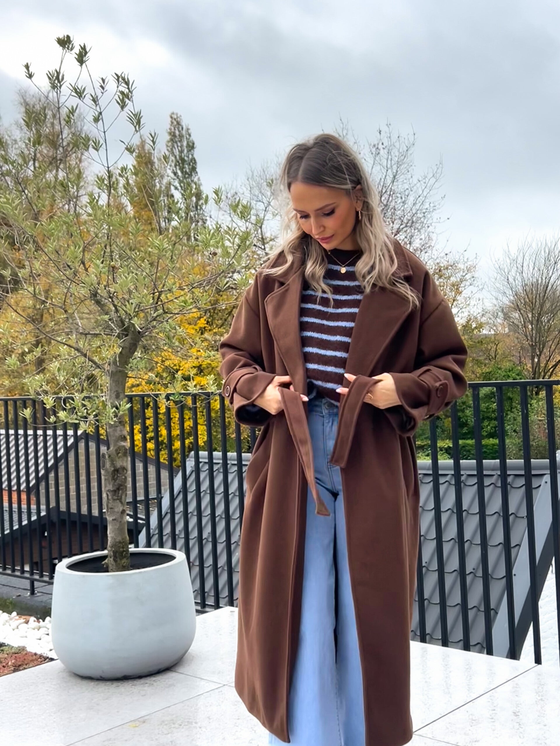 De bruine basis in combinatie met frisse blauwe strepen zorgt voor een moderne, stijlvolle look — perfect voor wie houdt van comfy met een twist.